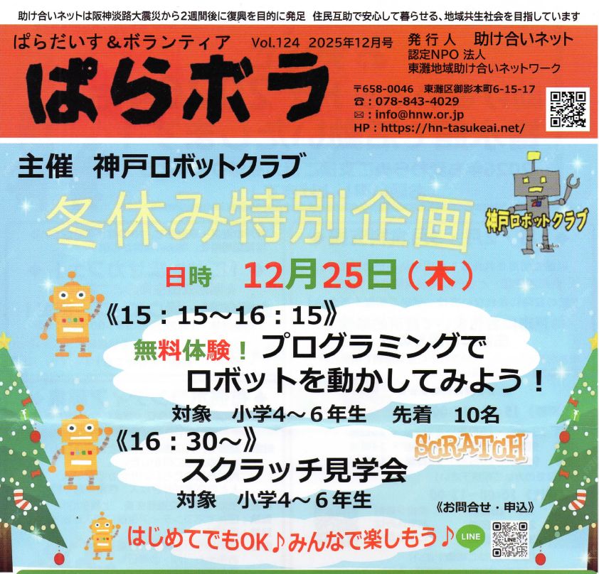 冬休み特別企画 お役立ち情報 2025.12.13 12/25(木)阪神御影の旨水館内、東灘地域助け合いネットワークで『冬休み特別企画』として①プログラムでロボットを動かしてみよう ②スクラッチ講座 見学会を行います 是非、覗いてみてください!!